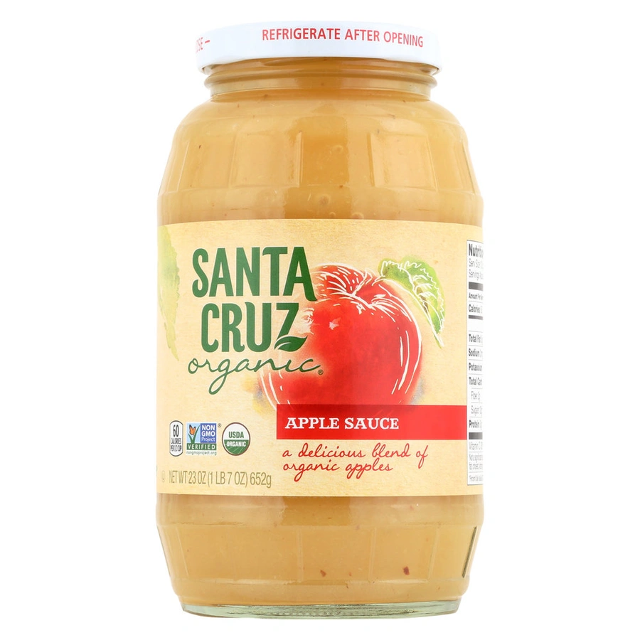 SANTA CRUZ ORGANIC APPLE SAUCE IS A 100% USDA ORGANIC CERTIFIED FOOD PRODUCT. THIS GLUTEN-FREE APPLE SAUCE COMES IN ONE 23 OZ. JAR AND IS PRODUCED WITH CERTIFIED RENEWABLE ENERGY. NON-GMO PROJECT VERIFIED, IT HAS 0 G. OF FAT AND CONTAINS 0 MG. OF SODIUM, 60 CALORIES AND JUST 15 G. OF CARBOHYDRATES PER SERVING.
