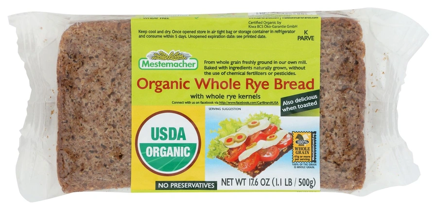 MESTEMACHER'S ORGANIC WHOLE RYE BREAD IS MADE WITH USDA ORGANIC CERTIFIED INGREDIENTS AND WHOLE-GRAIN. OUR BREAD IS FREE OF PRESERVATIVES, CHOLESTEROL AND WHEAT. OUR 17.6 OZ. LOAF IS KOSHER AND MADE WITH ORGANICALLY FARMED INGREDIENTS. EACH SERVING HAS 120 CALORIES, HAS A LONG SHELF LIFE AND IS DELICIOUS WHEN TOASTED. THE MESTEMACHER BREADS ARE PASTEURIZED. THIS BAKING PROCESS AT A VERY HIGH TEMPERATURE ENABLES THE BREADS TO STAY FRESH FOR ONE YEAR AFTER THE DATE OF PRODUCTION WITHOUT THE USE OF PRESERVATIVES. SEE NUTRITION FACTS PANEL FOR ALLERGENS. BAKED WITH NATURALLY GROWN INGREDIENTS FROM WHOLE GRAIN FRESHLY FOUND IN OUR OWN MILL WITHOUT THE USE OF CHEMICAL FERTILIZERS OR PESTICIDES.