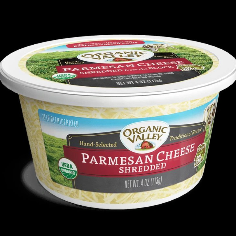 ORGANIC VALLEY PARMESAN CHEESE, SHREDDED FROM THE BLOCK IS A GREAT ADDITION TO YOUR FAVORITE RECIPES. THIS PRODUCT CAN BE USED AS A TOPPING ON PASTA OR BREAD AND IS MADE WITH THE MILK FROM PASTURE-RAISED COWS. ORGANIC VALLEY PARMESAN CHEESE COMES PACKAGED FOR YOUR CONVENIENCE IN A RESEALABLE TUB CONTAINING 4 OZ. OF PRODUCT.
