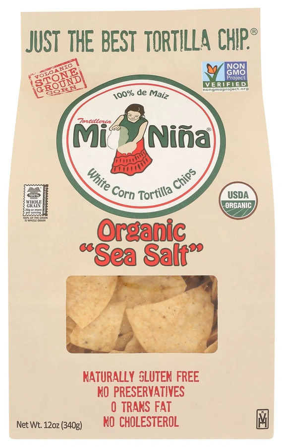 MI NINA'S WHITE CORN TORTILLA CHIPS WITH SEA SALT ARE NATURALLY GLUTEN-FREE, NON-GMO AND USE REAL, CERTIFIED KOSHER SEA SALT. OUR 12 OZ. BAG HAS 130 CALORIES AND IS FREE OF PRESERVATIVES. WE COOK WHOLE-GRAIN CORN WITH WATER AND LIME AND WE USE HAND-CARVED VOLCANIC STONES TO GRIND THE CORN MIXTURE - A PROCESS KNOWN AS “NIXTAMALIZATION.” OUR CHIPS ARE NATURALLY GOOD. JUST A BETTER CHIP.