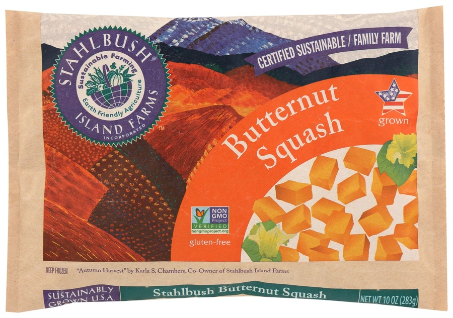 STAHLBUSH FROZEN BUTTERNUT SQUASH IS NON-GMO PROJECT VERIFIED, GLUTEN-FREE AND SUSTAINABLY GROWN IN THE U.S.A. EACH 10 OZ. BAG PROVIDES 3.5 1/2-CUP SERVINGS, EACHÂ CONTAINING JUST 35 CALORIES AND 0 G. OF FAT, SODIUM AND CHOLESTEROL. EACH 1/2-CUP SERVING OF STAHLBUSH FROZEN BUTTERNUT SQUASH PROVIDES 3 G. OF FIBER, 1 G. OF PROTEIN AND 190% OF THE DAILY RECOMMENDED VALUE OF VITAMIN A.