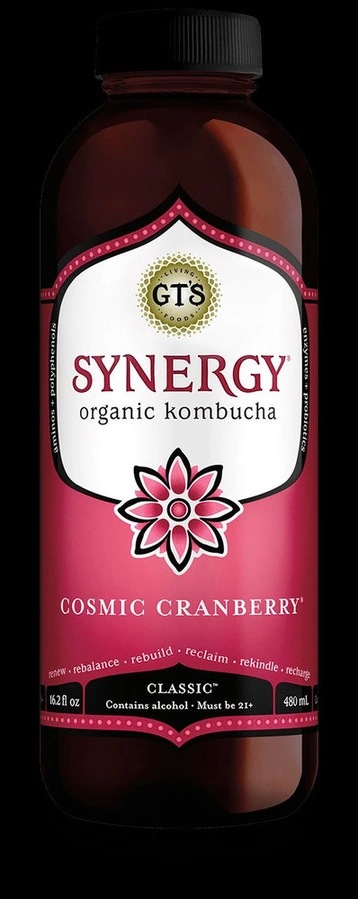 GT’S ENLIGHTENED SYNERGY, COSMIC CRANBERRY IS FOR EVERYONE, EVERYWHERE. THIS PRODUCT IS MADE FROM ORGANIC KOMBUCHA IN BATCHES SMALL ENOUGH TO HUG AND CONTAINS ENZYMES, POLYPHENOLS AND PROBIOTICS. GT’S ENLIGHTENED SYNERGY, COSMIC CRANBERRY COMES PACKAGED FOR YOUR CONVENIENCE IN A GLASS BOTTLE CONTAINING 16.2 FL. OZ. OF PRODUCT.
