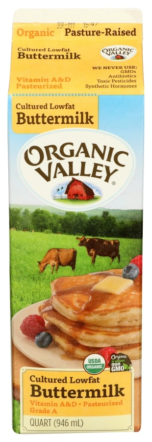 ORGANIC VALLEY CULTURED ORGANIC LOW FAT BUTTERMILK ADDS A SUBTLE RICHNESS TO EVERYTHING IT TOUCHES WITH AN OLD-FASHIONED, ARTISANAL FLAVOR THAT’S STRAIGHT OFF THE FARM. YOUR GRANDPARENTS MADE CULTURED BUTTERMILK A STAPLE FOR A REASON: IT'S NOT ONLY DELICIOUSLY REFRESHING, BUT ALSO RICH IN CALCIUM, RIBOFLAVIN, POTASSIUM AND VITAMINS. PRIZED BY BAKERS AND CHEFS, THIS ORGANIC BUTTERMILK ADDS A SPECIAL TOUCH WHEN USED TO MAKE BUTTERMILK BISCUITS, PANCAKE BATTER OR CREAMY, HOMEMADE BUTTERMILK RANCH DRESSING. IT ALSO TASTES DELICIOUS SERVED IN A TALL GLASS WITH A SLICE OF CORNBREAD ON THE SIDE. THIS QUART OF BUTTERMILK IS EASY TO OPEN AND POUR.