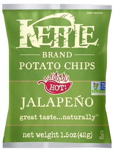 KETTLE BRAND JALAPENO POTATO CHIPS BRINGS A SPICY FLAVOR TO YOUR LIPS WITH JUST ONE BITE. THIS 1.5 OZ. BAG OF POTATO CHIPS IS THE PERFECT OPTION FOR A MIDDAY SNACK WHEN YOU'RE CRAVING A SALTY, YET SPICY FLAVOR-FILLED TREAT. THE RICH BLEND OF POTATOES, GARLIC POWDER AND JALAPENO POWDER OFFERS A ZESTY FLAVOR YOU CAN'T RESIST.