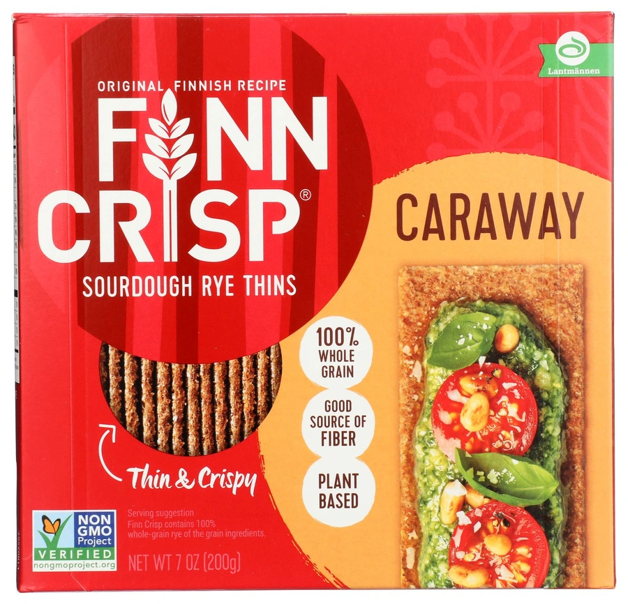 FINN CRISP CRISPBREAD, CARAWAY THIN RYE IS A UNIQUE SOURDOUGH RYE RECIPE THAT HAS BEEN BAKED TO PERFECTION TO GIVE YOU A HEALTHY SNACKING EXPERIENCE. WITH THE SUBTLE, SAVORY FLAVOR OF CARAWAY, THESE CRISPS ARE IDEAL AS A SNACK, AS AN ACCOMPANIMENT TO SALADS OR SOUPS, OR TOPPED WITH CHEESE, DIP OR HUMMUS. THESE WHOLE GRAIN SNACKS ARE MADE WITH ALL-NATURAL INGREDIENTS AND THEY ARE KOSHER AND NON-GMO. EACH BOX OF FINN CRISP CRISPBREAD, CARAWAY THIN RYE CONTAINS 7 OZ. OF PRODUCT.