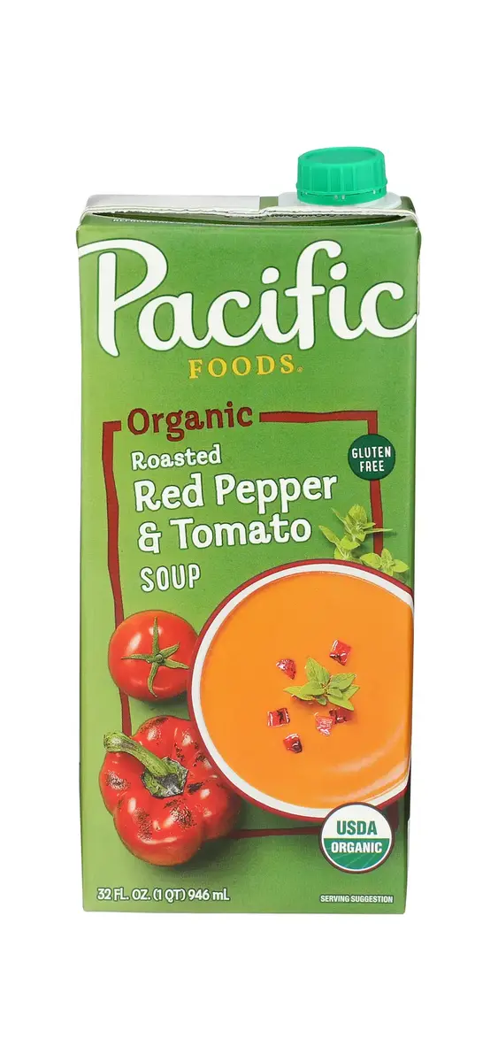 PACIFIC FOODS SOUP, ROASTED RED PEPPER & TOMATO IS A NATURAL AND DELICIOUS MEAL OPTION. MADE WITH NATURAL INGREDIENTS, THIS SOUP IS FREE OF UNNATURAL AND UNNECESSARY ADDITIVES. THIS PRODUCT IS GLUTEN-FREE. EACH CARTON OF PACIFIC FOODS SOUP, ROASTED RED PEPPER & TOMATO CONTAINS 32 OZ. OF SOUP WITH FOUR SERVINGS PER CONTAINER AND 110 CALORIES PER SERVING. REFRIGERATE AFTER OPENING.