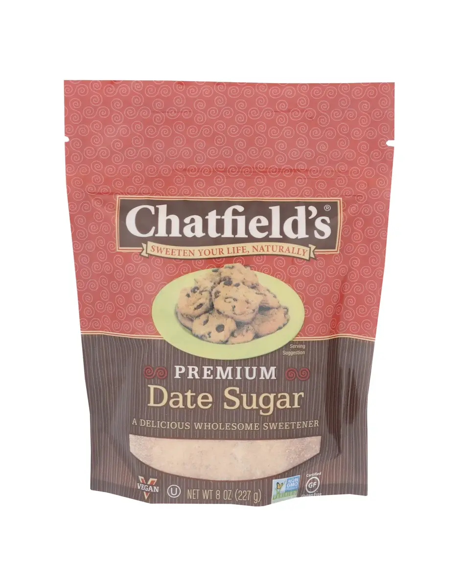 CHATFIELD'S ALL NATURAL DATE SUGAR SWEETENS YOUR FAVORITE RECIPES USING JUST ONE SIMPLE INGREDIENT - GRANULATED DEHYDRATED DATES. USE IT TO ADD DELICIOUS, WHOLESOME SWEETNESS TO PUDDINGS, CAKES, COOKIES AND OTHER PASTRIES, AND FEEL GOOD SERVING THESE BAKERY CREATIONS TO YOUR FAMILY AND FRIENDS. PACKED IN A 8 OZ. BAG, THIS NATURAL ALTERNATIVE TO REFINED SUGAR ALSO CONTAINS 0.5 G. OF FIBER PER 1 TSP., MAKING IT THE BETTER CHOICE COMPARED TO OTHER SWEETENERS.
