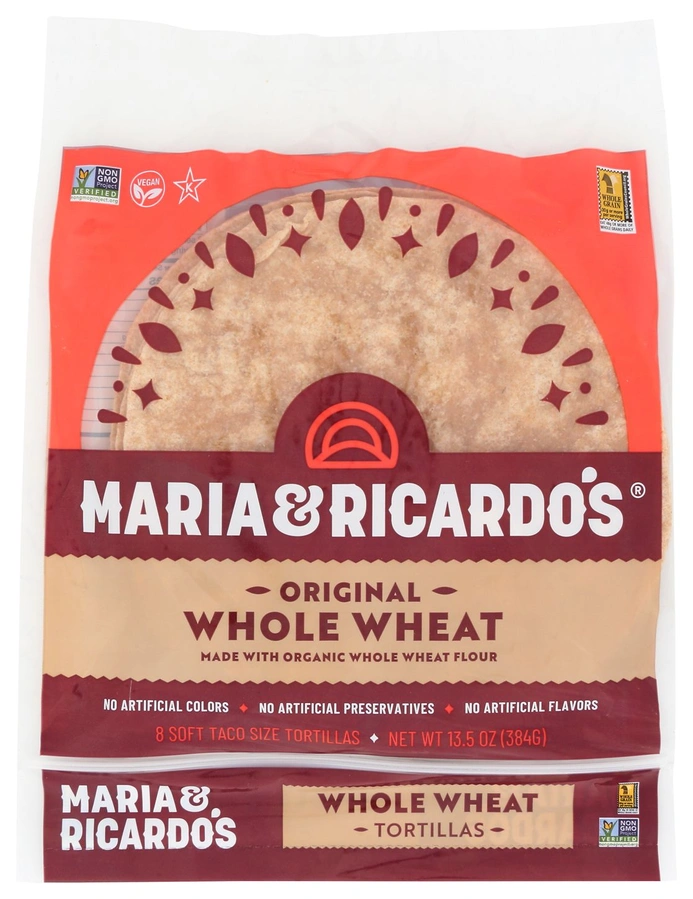 MARIA AND RICARDO'S WHOLE WHEAT TORTILLAS ARE MADE WITH ORGANIC FLOUR WITHOUT ANY PRESERVATIVES FOR A WHOLESOME ADDITION TO CLASSIC MEXICAN DISHES. THESE TACO-SIZED TORTILLAS OFFER THE PERFECT BASE FOR MAIN COURSES, DESSERTS, OR APPETIZERS. EACH 13.5 OZ. BAG CONTAINS EIGHT TORTILLAS, SO YOU CAN SERVE UP HEARTY HELPINGS OF YOUR FAVORITE RECIPES FOR THE WHOLE FAMILY.