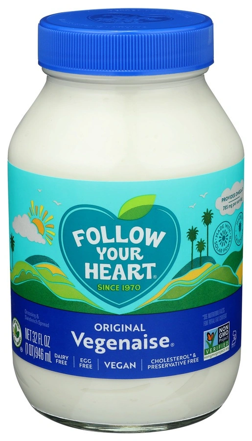 FOLLOW YOUR HEART ORIGINAL VEGENAISE IS A DELICIOUS AND NUTRITIOUS MAYONNAISE ALTERNATIVE. IT IS VEGAN, GLUTEN-FREE, DAIRY-FREE, KOSHER AND NON-GMO, AND IT HAS NO PRESERVATIVES OR ARTIFICIAL FLAVORS. IT IS MADE FROM EXPELLER-PRESSED CANOLA OIL, FILTERED WATER, BROWN RICE SYRUP AND OTHER FLAVORINGS. NOW YOU CAN ENJOY REAL MAYONNAISE TASTE WITH THIS EGG-FREE VEGENAISE. ANYWHERE YOU WOULD USE MAYO, VEGENAISE WORKS. EACH JAR CONTAINS 32 FL. OZ. OF VEGENAISE.