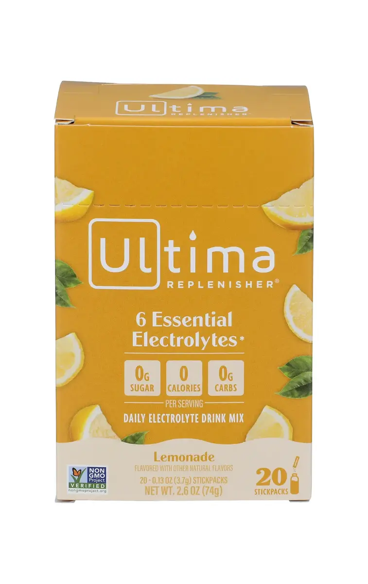 USING ULTIMA REPLENISHER LEMONADE ELECTROLYTE POWDER, GET YOUR HYDRATION ON-THE-GO WITH THESE HANDY SINGLE-SERVING STICK PACKS. ULTIMA CONTAINS A PERFECT BALANCE OF ALL 6 ELECTROLYTES PLUS SUPPORT MINERALS THAT WORK TOGETHER TO PROVIDE COMPLETE HYDRATION WITHOUT STOMACH UPSET SO YOU CAN FEEL AND PERFORM YOUR BEST. ULTIMA IS SWEETENED WITH STEVIA LEAF AND MADE WITH REAL FRUIT‑FLAVORS THAT TASTE DELICIOUS. THIS FORMULATION CONTAINS VITAMIN C WHICH SUPPORTS A HEALTHY IMMUNE SYSTEM, PROTECTS THE CELLS FROM OXIDATIVE STRESS AND CONTRIBUTES TO THE REDUCTION OF TIREDNESS AND FATIGUE. THE STAPLE NUTRIENTS THAT ULTIMA PROVIDES ARE PHOSPHORUS TO OXYGENATE MUSCLES, SELENIUM AS AN ANTIOXIDANT SUPPORT, ZINC FOR RECOVERY AND NEURON SUPPORT, MAGNESIUM FOR PREVENTING MUSCLE CRAMPS, POTASSIUM FOR CARDIAC MUSCLE SUPPORT, SODIUM AND CALCIUM FOR MUSCLE CONTRACTION AND NERVE FUNCTION AND CHLORIDE FOR OSMOTIC PRESSURE SUPPORT. INCLUDES TWENTY 0.12 OZ. PACKETS OF LEMONADE ELECTROLYTE POWDER.