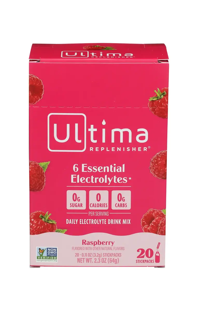 USING ULTIMA REPLENISHER RASPBERRY ELECTROLYTE POWDER, GET YOUR HYDRATION ON-THE-GO WITH THESE HANDY SINGLE-SERVING STICK PACKS. ULTIMA CONTAINS A PERFECT BALANCE OF ALL 6 ELECTROLYTES PLUS SUPPORT MINERALS THAT WORK TOGETHER TO PROVIDE COMPLETE HYDRATION WITHOUT STOMACH UPSET SO YOU CAN FEEL AND PERFORM YOUR BEST. ULTIMA IS SWEETENED WITH STEVIA LEAF AND MADE WITH REAL FRUIT‑FLAVORS THAT TASTE DELICIOUS. THIS FORMULATION CONTAINS VITAMIN C WHICH SUPPORTS A HEALTHY IMMUNE SYSTEM, PROTECTS THE CELLS FROM OXIDATIVE STRESS AND CONTRIBUTES TO THE REDUCTION OF TIREDNESS AND FATIGUE. THE STAPLE NUTRIENTS THAT ULTIMA PROVIDES ARE PHOSPHORUS TO OXYGENATE MUSCLES, SELENIUM AS AN ANTIOXIDANT SUPPORT, ZINC FOR RECOVERY AND NEURON SUPPORT, MAGNESIUM FOR PREVENTING MUSCLE CRAMPS, POTASSIUM FOR CARDIAC MUSCLE SUPPORT, SODIUM AND CALCIUM FOR MUSCLE CONTRACTION AND NERVE FUNCTION AND CHLORIDE FOR OSMOTIC PRESSURE SUPPORT. INCLUDES TWENTY 0.11 OZ. PACKETS OF RASPBERRY ELECTROLYTE POWDER.